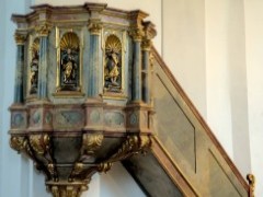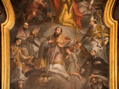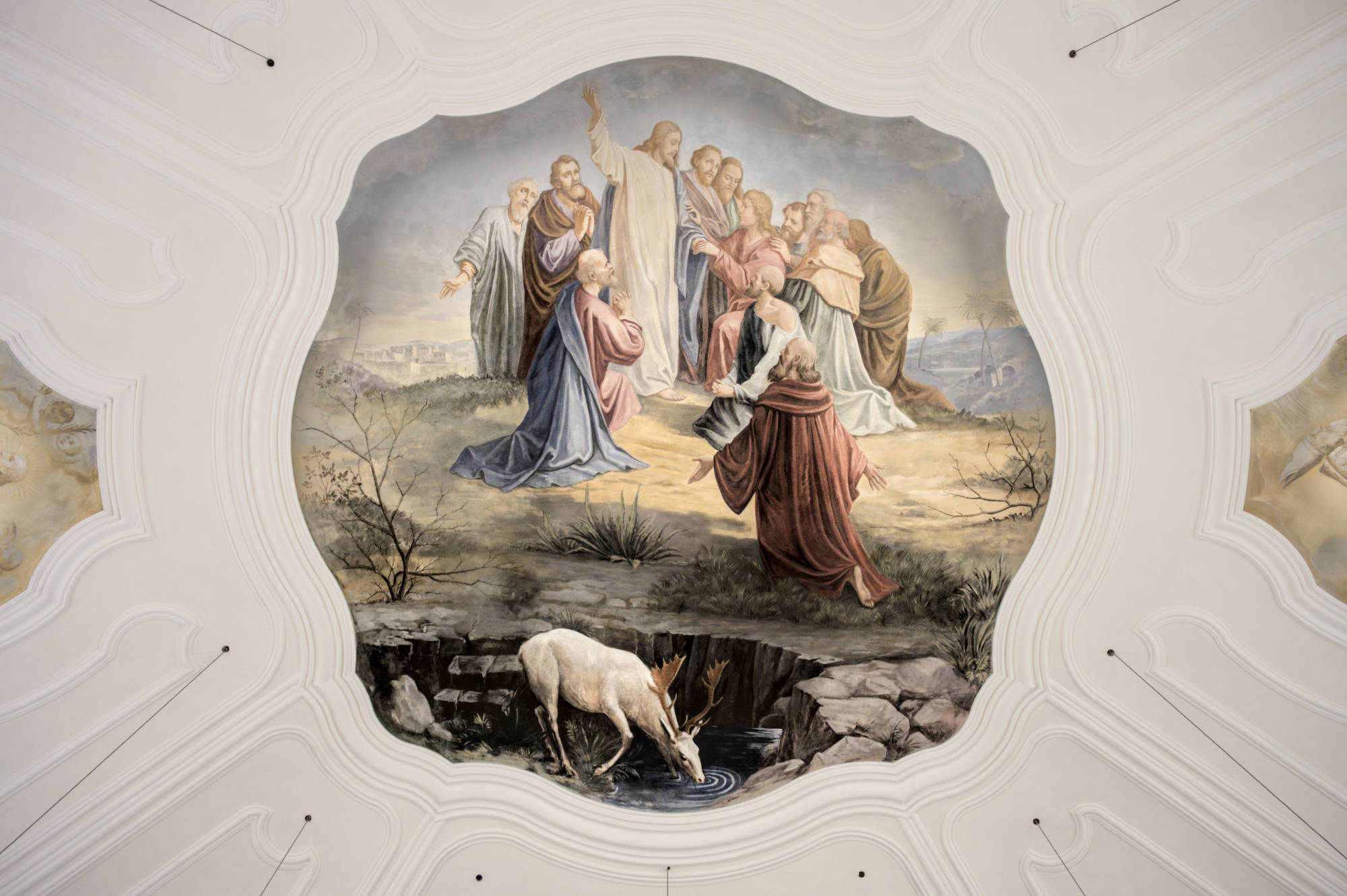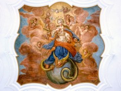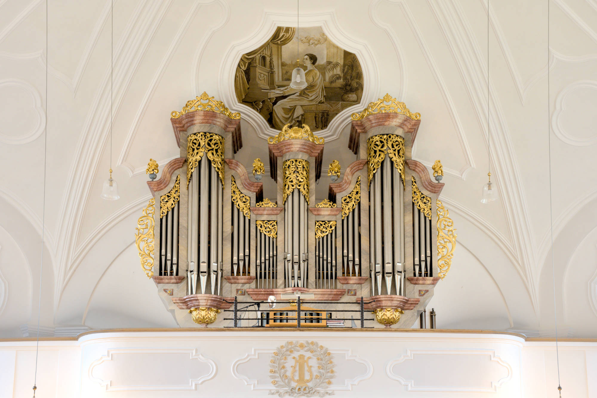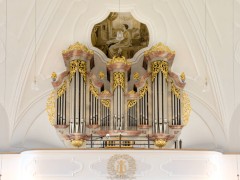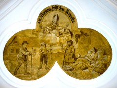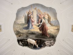 Im achteckigen Anbau, um den die Kirche im Jahr 1914 erweitert wurde, finden wir ein Deckengemälde, das die Himmelfahrt Jesu zeigt. In den vier kleinen Kuppeln ist je ein Bild der Patrone der beiden Filialkirchen hl. Andreas und hl. Nikolaus, sowie ein Bild des hl. Antonius und der Patronin der Kirchenmusik, der hl. Cäcilia, wobei wir schon bei unserer im Jahr 1986 geweihten Orgel wären.