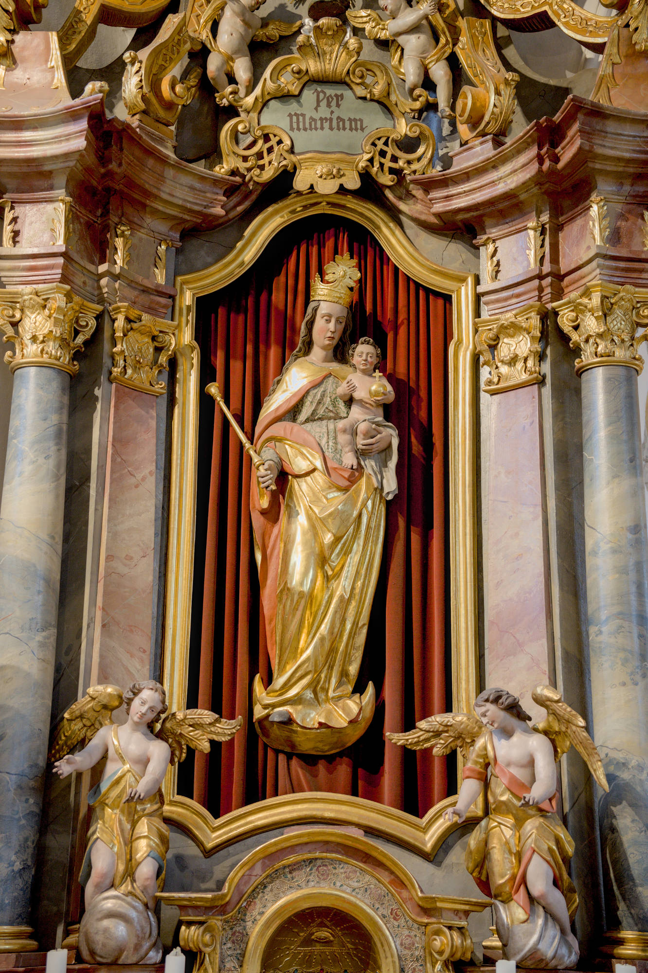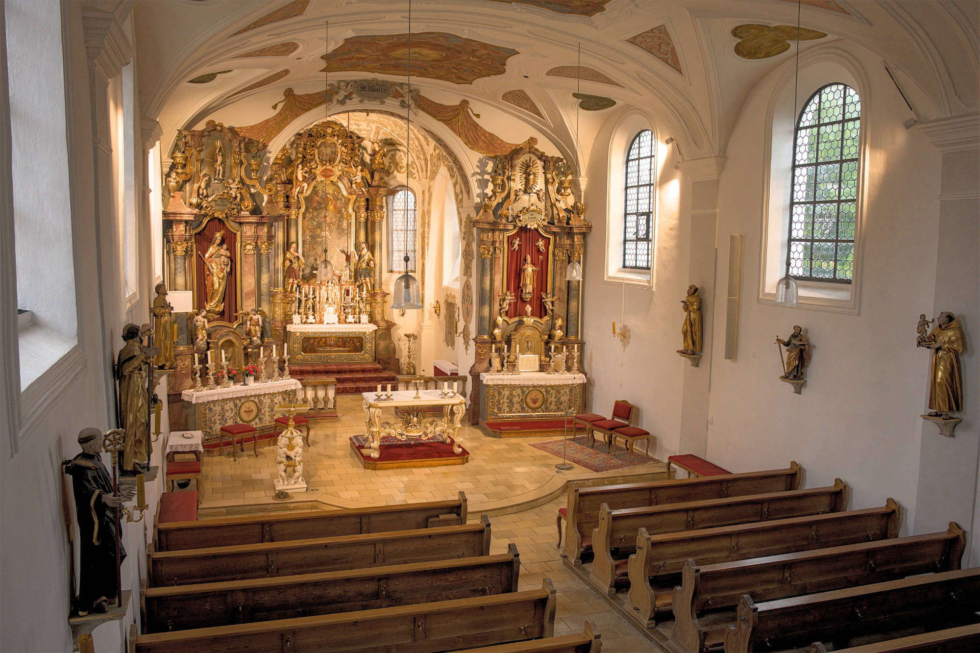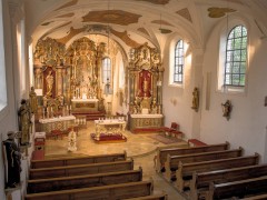 Der Altarraum wurde 1979 neu gestaltet und bei der Innenrenovierung 1982 mit einem neuen Volksaltar, Ambo und Steinboden versehen. Die beiden Seitenaltäre zeigen zum einen eine Figur des Kirchenpatrons, des hl. Blasius, zum anderen eine gotische Madonna aus der Filialkirche Winden.