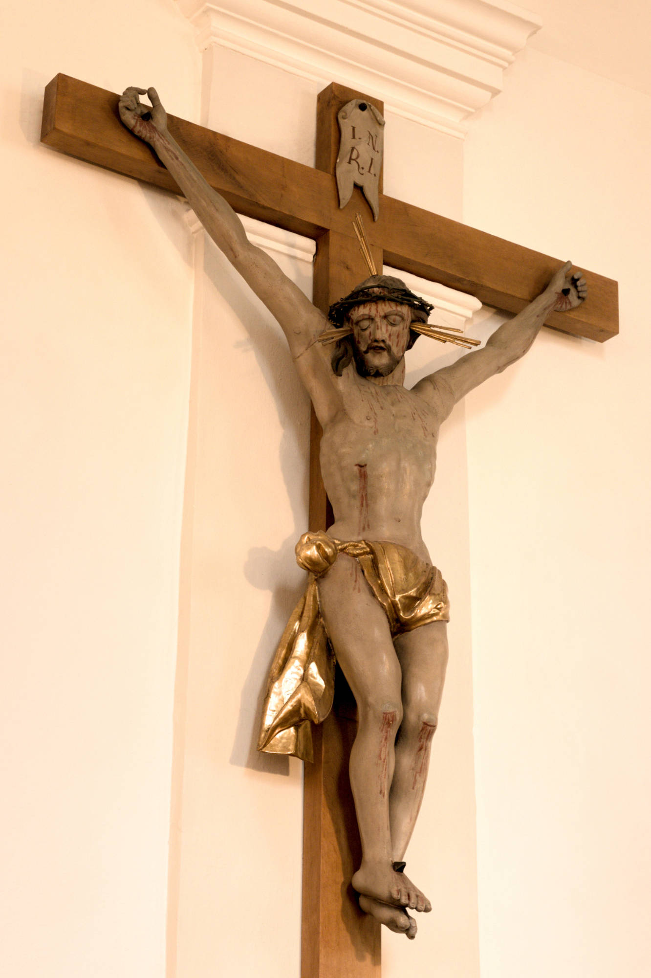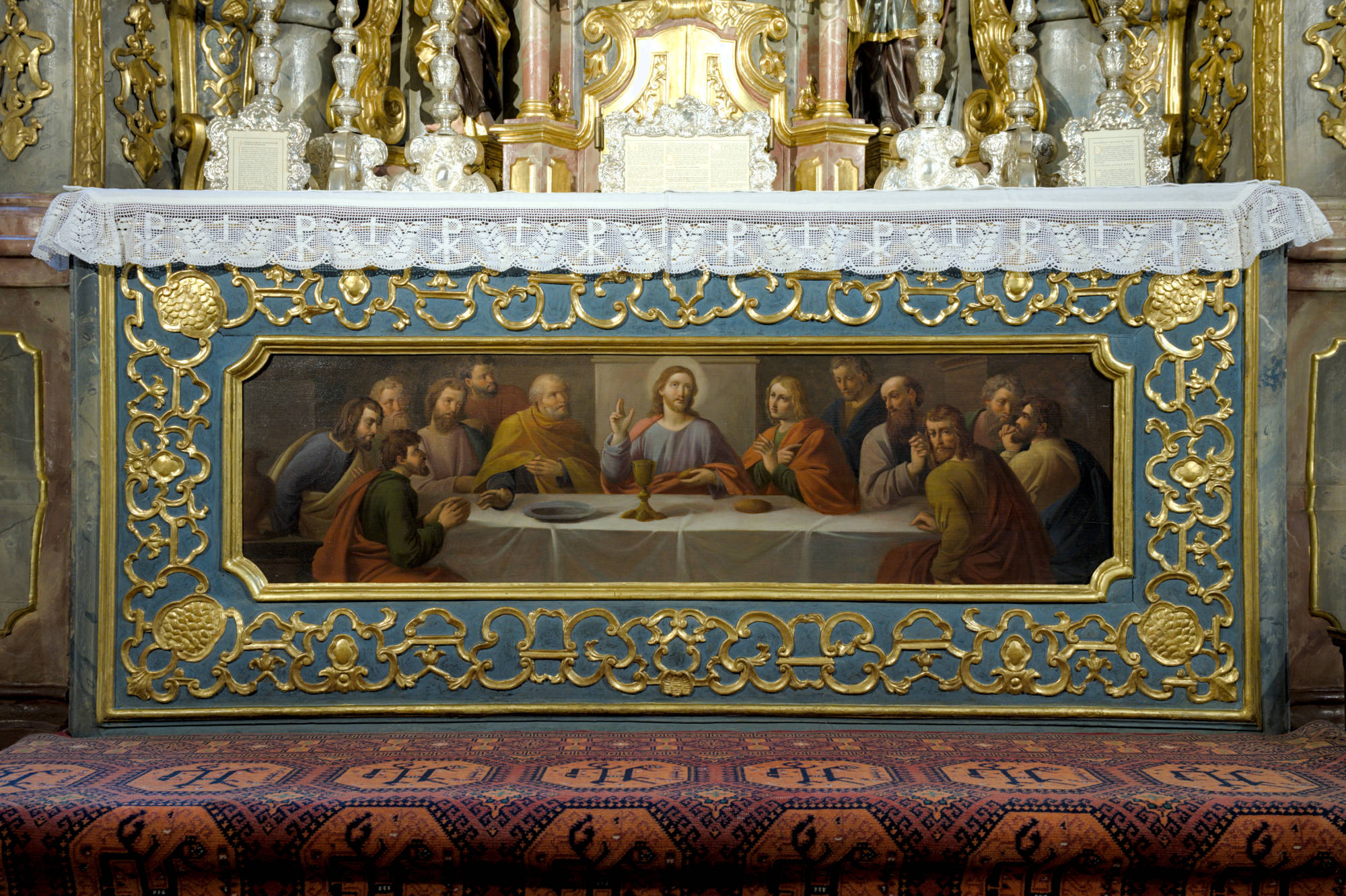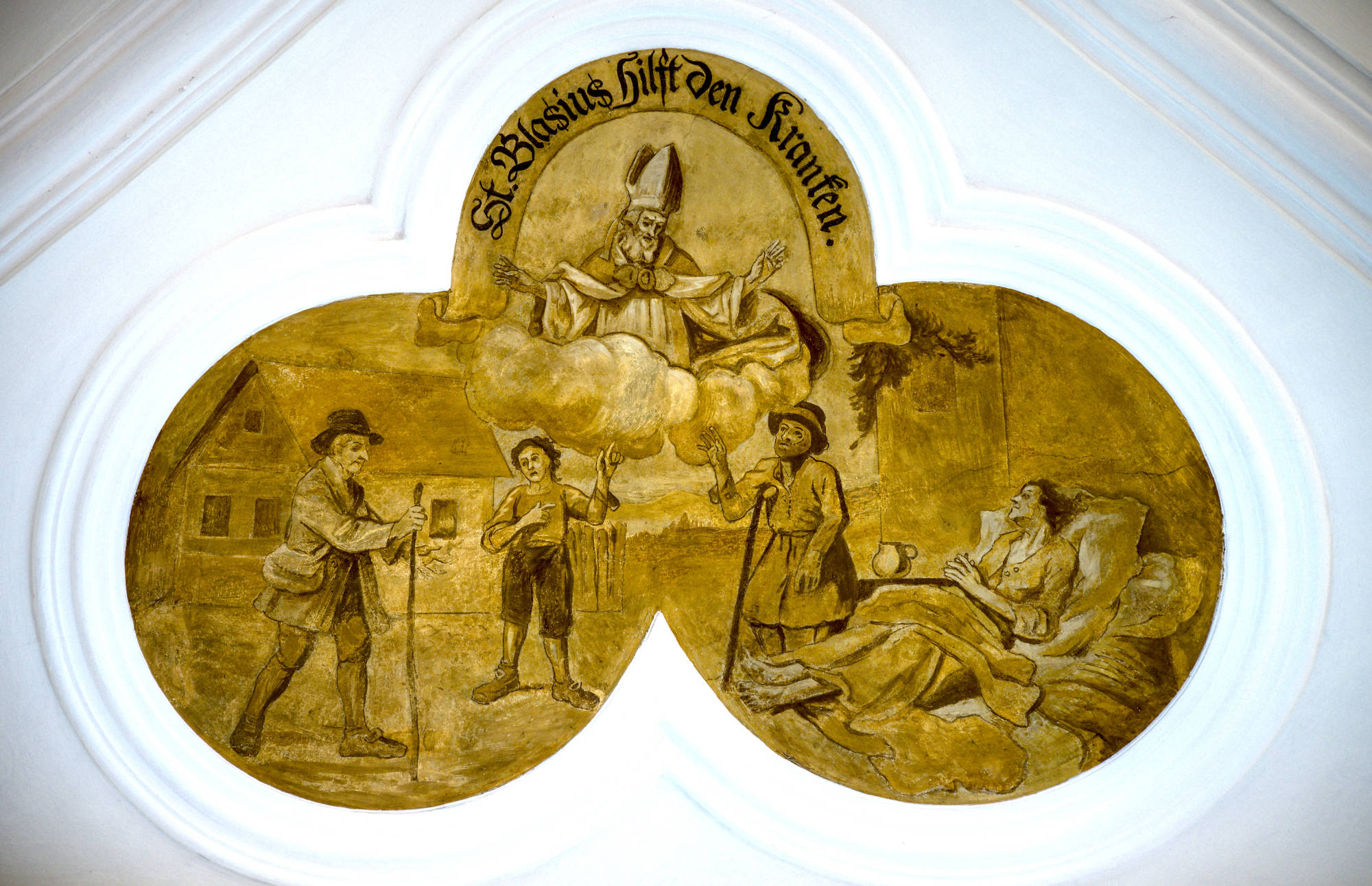 Im Inneren der Kirche ist der Patron, der heilige Bischof Blasius, öfters vertreten: Im Hochaltarbild steht er in der Mitte der übrigen 14 Nothelfer. Das Deckengemälde über dem Volksaltar zeigt sein Martyrium. Über den sechs Fenstern des Langhauses erzählen Stichkappen Episoden aus der Heiligenlegende. Den rechten Seitenaltar ziert eine Statue des Heiligen mit den typischen zwei gekreuzten Kerzen. In dieser Form, d. h. mit zwei gekreuzten Kerzen, wird bis heute am 3. Februar der Blasiussegen zum Schutz vor Halskrankheiten und allen anderen Krankheiten des Leibes und der Seele erteilt.